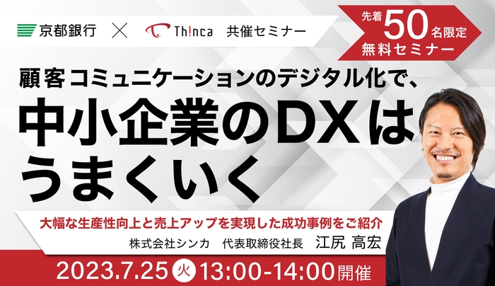 コミュニケーションプラットフォーム「カイクラ」の開発・販売を行う株式会社シンカ(本社:東京都千代田区、代表取締役社⻑ 江尻高宏、以下、「シンカ」)は、株式会社京都銀行(本社:京都市下京区、取締役頭取 安井幹也、以下、「京都銀行」)と共催で7月25日に共催セミナー「顧客コミュニケーションのデジタル化で、中小企業のDXはうまくいく」を開催します。