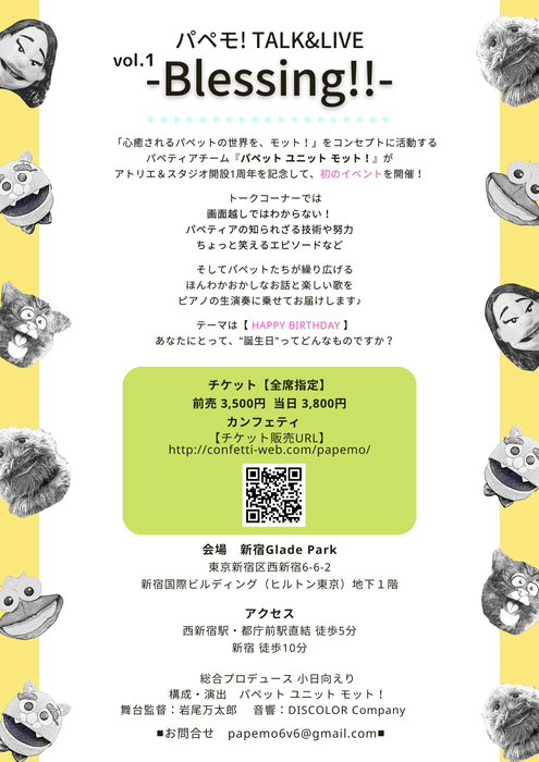 有名パペットショーキャストが中心で立ち上げたパペット ユニット モット!1周年記念イベント『パペモ! TALK&LIVE vol.1 -Blessing!!-』開催! カンフェティにてチケット販売