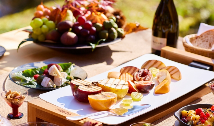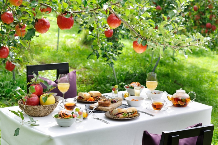 また、2000本以上のりんごの木が並ぶ農園に設えた、オープンエアの特別席で食べるブランチを用意します。サンドイッチやキッシュ、サラダとともに、旬のフルーツを味わいます。収穫したばかりのりんごに加えて、プルーンやぶどう、洋ナシなど、さまざまなフルーツを生のままはもちろんのこと、ホットプレートで焼いたり、紅茶の中に入れたりして楽しむことができます。