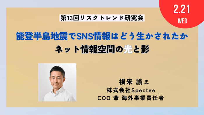 今回は「能登半島地震でSNS情報はどう生かされたか」をテーマに、SNS情報を初動対応に活用した事例の紹介とともに、マイナス面であるデマの発生事例、デマに対する対策などについてもレクチャーいただき、インターネット空間の災害情報を活用する際の留意点を考えます。