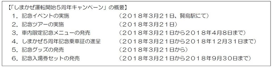 近鉄では、観光特急「しまかぜ」の運転開始5周年を記念して、これまでのご愛顧への感謝の気持ちと、これからも多くのお客さまにご利用いただきたいとの思いを込め、「しまかぜ運転開始5周年キャンペーン」を2018年3月21日(水・祝)から実施いたします。