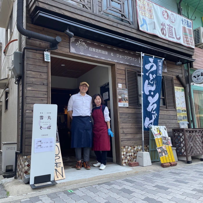 店主は、大阪ひろ富そばで修行中で、看板娘のお母さんとの二人で営業しています。修業中のため本格的なざるそばのセットが700円とリーズナブルな価格に設定されています。シコシコの蕎麦と白胡麻油が効いた炊き込みご飯が美味しいと評判です。お店は間借りで営業しており、実績を積んで将来は地元の奈良県王寺町に実店舗を出店することを目標としています。店名は、王寺町のキャラクター「雪丸くん」を使用しており、許可を得ています。