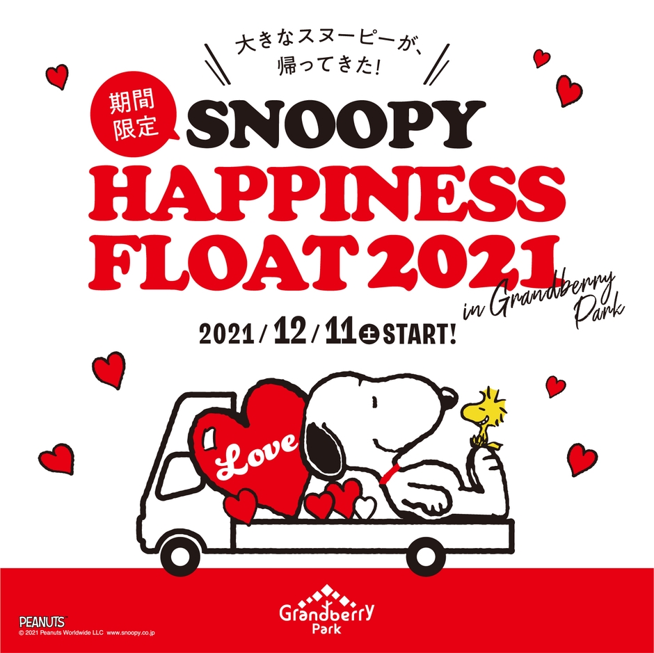 株式会社ソニー・クリエイティブプロダクツ(本社:東京都港区、代表取締役:大竹 健)は、PEANUTSコミックのプロモーションの一貫として、「LOVE EACH OTHER, AND I LOVE ME.」をテーマとして全国のみなさんにピーナッツの魅力とLOVEのメッセージをお届けするために、2021年10月13日(水)より東京を出発した、大きなスヌーピーを乗せたトラック『SNOOPY HAPPINESS FLOAT 2021(スヌーピーハピネスフロート)』が、いよいよ終盤、九州、横浜での運行を残すのみとなり、最終地点として、東京に帰還後、本年も、世界で唯一のシュルツ美術館の公式サテライト「スヌーピーミュージアム」のある南町田グランベリーパークへの期間限定の設置・展示することが決定したことを発表いたします。大きなスヌーピーは、ハートやウッドストックとともに2021年12月11日(土)から2022年5月8日(日)までアウトレット複合商業施設「グランベリーパーク」内の広場「パークプラザ」の芝生の上で、ご来場のみなさんに、ピーナッツからの「LOVE」をお届けします。