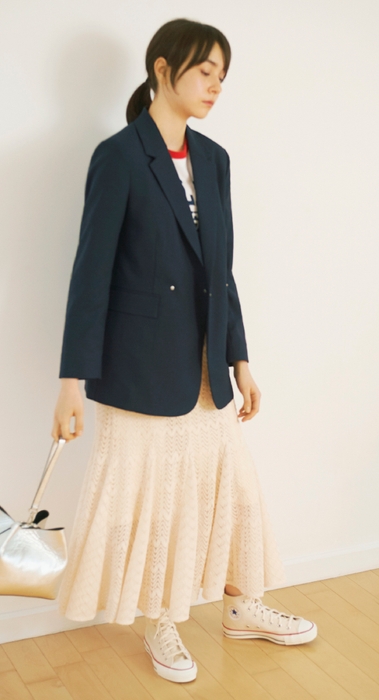 すっきりとした腰周り、裾に向かって贅沢にフレア分量をとったマーメイドラインのスカートは、動くたびに揺れて覗く2種類のレースが女性らしい印象に。ウエストはストレスフリーのゴム仕様で、裏側にグログランテープをたたくなど、細かなディテールにもこだわりました。きれいめなブラウスはもちろん、Tシャツなどのカジュアルなアイテムとも相性抜群です。