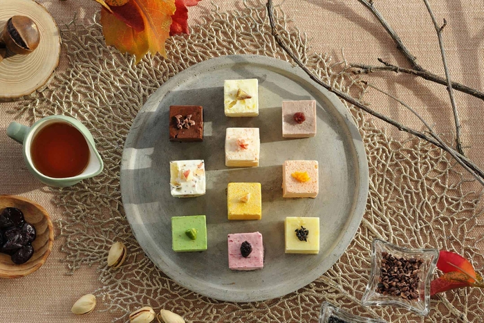 本イベントでは、食べるバターを10種類のフレーバーで提供します。バターの風味を楽しみながら、素材そのものの味を楽しめるよう、開発しました。ファーム星野のトマム牛乳を使ったバターに合わせるのは、蟹や鮭、ハスカップといった北海道ならではの食材や、かぼちゃや栗といった秋ならではの食材です。「蟹と昆布」は、ほぐした蟹の身に濃厚な蟹味噌と昆布の塩味を、バターで整えるようにマイルドな味わいに仕上げました。また、「ハスカップとミルクジャム」は、果実の酸味とトマム牛乳を使ったミルクジャムの甘さがバターによって調和されます。また、食べるバターは色鮮やかな見た目にもこだわり、ショーケースに並べて販売します。