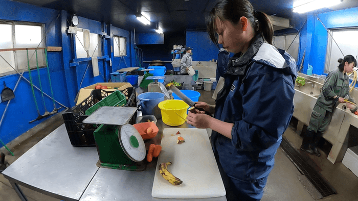 週2回仕入れる新鮮なリンゴをそれぞれの動物に合わせて切り分ける手捌きとスピードに注目!