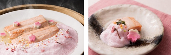 桜の葉と花で香り付けしたサーモンを蒸しあげました。ビーツでほんのり色付いたとろろとご一緒にお召しあがりください。