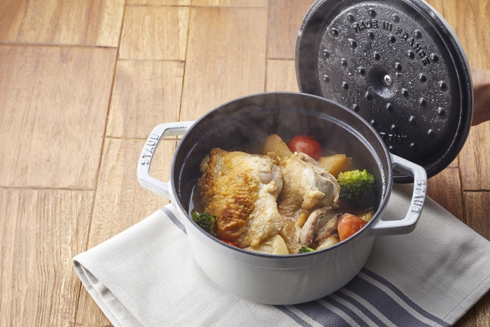 鍋本体・蓋ともに厚みのある鋳鉄製。食材をムラなく優しく加熱し、食材の旨みを含む水分は蒸気となって鍋の中に充満。そして、蒸気は蓋裏の突起「ピコ」や「システラ」を介して、旨みを含んだ水滴となって再び食材へと戻ります。旨みを閉じ込めて仕上げるストウブ独自の仕組み「アロマ・レイン」により、野菜は甘さが引き立ち、お肉も柔らかくジューシーに。出汁を加えなくても、滋味深い味わいが鍋まかせで完成します。