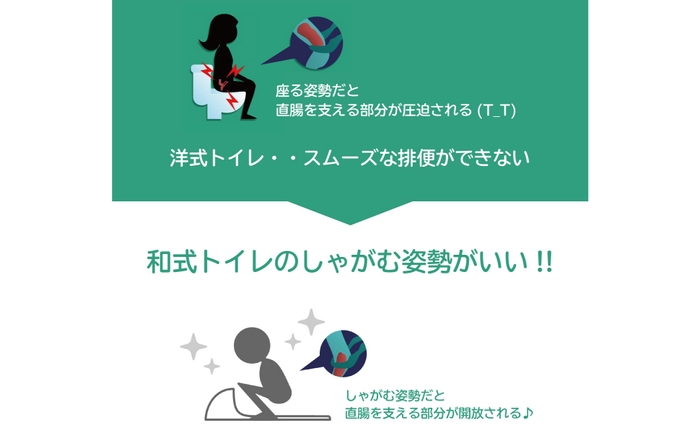 「和式スタイル」のしゃがむ姿勢だと 直腸が解放されてスムーズに排便できるんです!