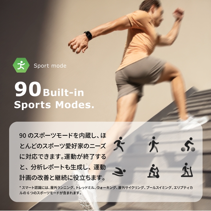 新しいAmazfitスマートウォッチは、ほとんどのスポーツ愛好家のニーズをカバーするために90の組み込みスポーツモードを備えています。インテリジェントな認識機能を備えたフィットネストラッキング機能は、身体の移動を開始すると自動的にアクティブになります。終了すると、システムは分析レポートも生成します。