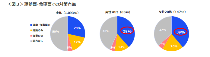 他年代と比べて、男性20代は「高負荷運動+プロテイン摂取」、女性20代は「低負荷運動+カロリー計算アプリ」と運動・食事の両面で対策をしている割合が高い。<図2・図3>