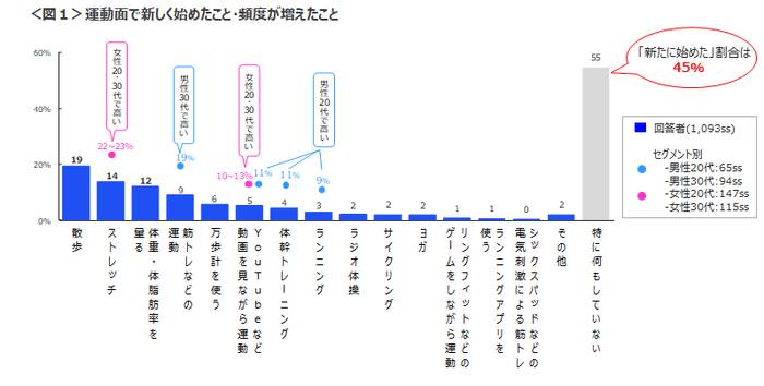 散歩や体重測定以外で、性年代別に見ると男性20-30代で「筋トレ」「動画を見ながら運動」「体幹トレーニング」「ランニング」といった高負荷の運動をしている一方、女性20-30代では「ストレッチ」「動画を見ながら運動」といった低負荷の運動をしている様子が伺える。<図1>
