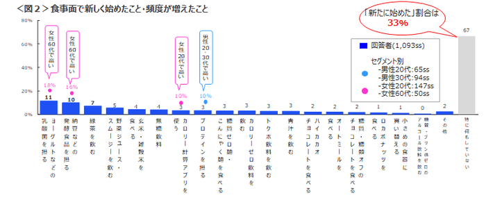 食事面で「新たに始めた」ことがある人の割合は3割程度。 乳酸菌や発酵食品といった免疫面にも効果がありそうな“身近な”食品摂取がコロナ太り対策として取り入れられている。