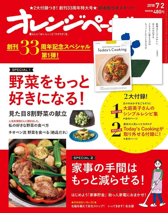 株式会社オレンジページ(東京都港区)が月2回発行する生活情報誌『オレンジページ』は、創刊33周年を迎えました。記念企画は2号連続2大付録つき! 第1弾となる6月15日(金)発売の7/2号は、日々のおかずをごちそうに変える大庭英子さんのシンプルレシピ集(※1)と毎日の献立に役立つレシピカタログ「Today’s Cooking」の付録つきで、特別定価480円で発売になりました。