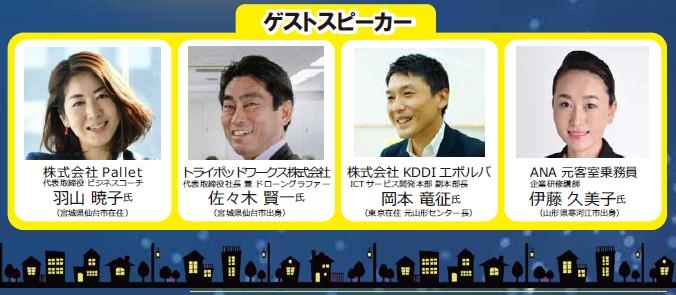 仙台市、山形市にゆかりのあるゲストスピーカー4名を招き、それぞれの仕事観やワークスタイルを語っていただきます。さまざまな働き方を提示することで、将来を考えるヒントを提供します。終了後は、仙台、山形の名物を食べながら、参加者とゲストスピーカーの交流会を行います。