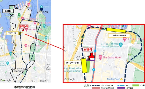 本物件は、1980年に竣工した、地上33階・地下4階建ての複合施設(オフィス・商業)で、オーストラリアの最大都市であるシドニー市のCBD(※2)のメインストリート(George Street)に面しています。周辺には、大手企業のオフィスやハイブランドの商業施設(旗艦店)、歴史的建造物等が立地しています。また、都市鉄道であるシドニートレインズのウィンヤード駅に地下で直結しているほか、近くにLRT(路面電車)の駅や多くのバス停等があり、交通利便性にも優れています。