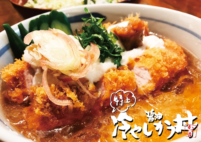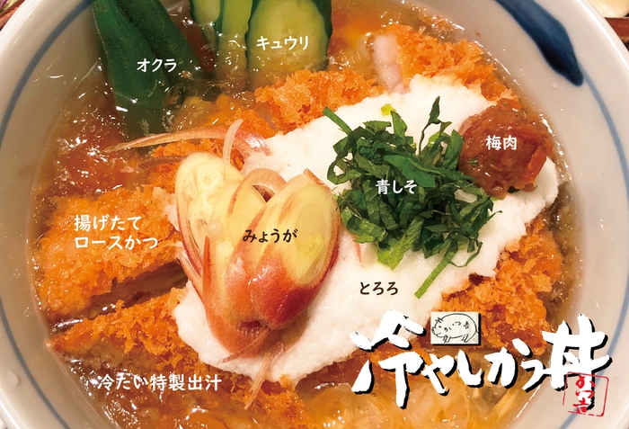 丁寧に取った天然出汁をベースに、濃い目の特製醤油出汁を作り、冷水で洗った白米、揚げたての「とんかつ」。そこに夏野菜(みょうが・キュウリ・オクラ・青しそ)と梅肉、「とろろ」を盛り付けます。仕上げにクラッシュ氷を入れ、キンキンな冷たさでお召上がり頂く丼です。天然出汁は鹿児島県枕崎産の「鰹節」、北海道産「真昆布」、千葉県九十九里産の「煮干し」と品質と安全にこだわる、素材を生かした味わいです。