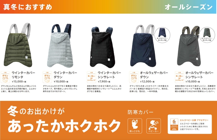 2013年の販売開始から多くのファミリーの高評価を得ているエルゴベビー専用防寒カバーは、お客様のリクエストに応えたバリエーションを毎年増やしています。今季は、定番の「ウインターカバー」、質感にこだわった「ウインターダウンカバー/メランジ」、オールシーズン使用できる「オールウェザーダウンカバー」に、新シリーズ「オールウェザーカバー」と「ウィンターダウンカバー/リモンタ」の2種が加わり、全5シリーズ各3色、全15種類にて展開します。