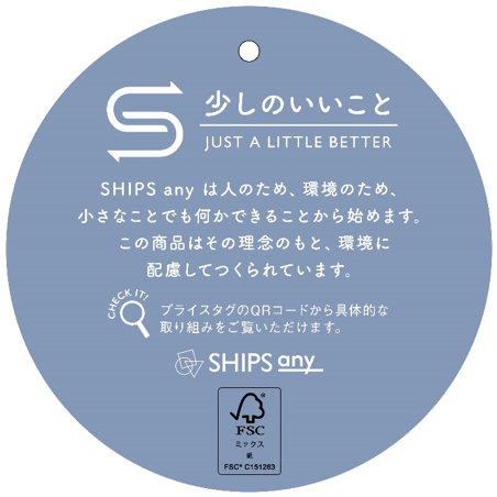 また、地球・社会や暮らしに優しい取り組みである“SHIPS any少しのいいこと”として、環境に配慮したハンガーの採用、ショッパーやプライスタグにFCS認定紙を使用するなど、小さなことでも何か出来ることから歩き出します。