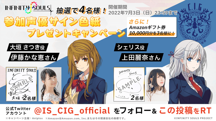 ① 抽選で大垣さつき役 伊藤かな恵 さん・シェリス・マクシモヴァ役 上田麗奈 さんのサイン色紙を2名ずつ、