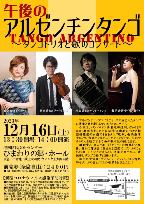 今回は、バンドネオン奏者池田達則、ヴァイオリニスト専光秀紀、ピアニスト宮沢由美のトリオと劇団俳優座の女優でもあるタンゴ歌手、長浜奈津子により、古典タンゴからモダンタンゴまで、多彩で多くの人を魅了する名曲の数々をお届けします。