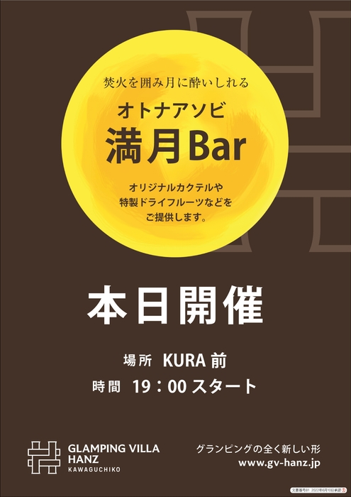 株式会社ハンズアウトドアリゾート(本社:神奈川県横浜市港北区新横浜2-2-8アーバンセンター新横浜3階、代表取締役:韓 宇)は、宿泊者限定の満月の夜にだけ行う月に1度の「満月Bar」を開催します。9月は9月9日(金)、満月当日の9月10日(土)の2日間 グランピングヴィラハンズ河口湖 山梨県南都留郡富士河口湖町勝山3283-1にて開催致します。