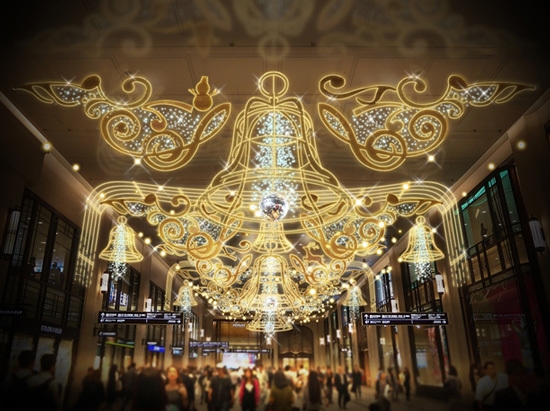 梅田阪急ビルコンコース クリスマス・イルミネーション 「BELLのCONCERTO」 ~はじまりを告げる、光の協奏曲~ さまざまなベルが光り響きあうコンチェルトホールが出現