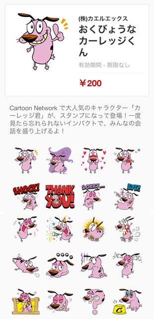 アニメ専門チャンネル「カートゥーン ネットワーク」(http://www.cartoon.co.jp/)を運営するターナージャパン株式会社(本社:東京都中央区、執行役員兼ジェネラル・マネージャー:トム・ペリー)は、LINE株式会社(本社:東京都渋谷区、代表取締役社長:森川亮)が運営する無料通話・無料メールスマートフォンアプリLINE内の「スタンプショップ」にて、2013年12月より 「おくびょうなカーレッジくん」のスタンプ配信を開始しました。