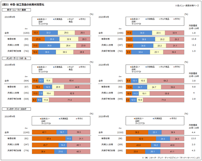 加工食品の利用状況をみると、「餃子類」「ハンバーグ類」「揚げ物類」ともに「冷凍食品」が増加している。世帯タイプ別に見ると、「餃子類」に関してはどの世帯でも「手作り」が増加し、「チルド」の利用が減少している。子有り世帯ではその他のメニューでも「手作り」が増えているが、単身世帯では「手作り」率が下がったメニューが多い。