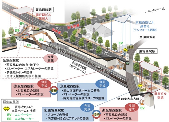 京福電気鉄道と阪急電鉄では、「西院地区バリアフリー移動等円滑化基本構想」に基づき、京福電気鉄道嵐山線(嵐電)西院駅および阪急西院駅の更なる安全性と利便性の向上を図るため、バリアフリー化工事を協力して推し進めています。
