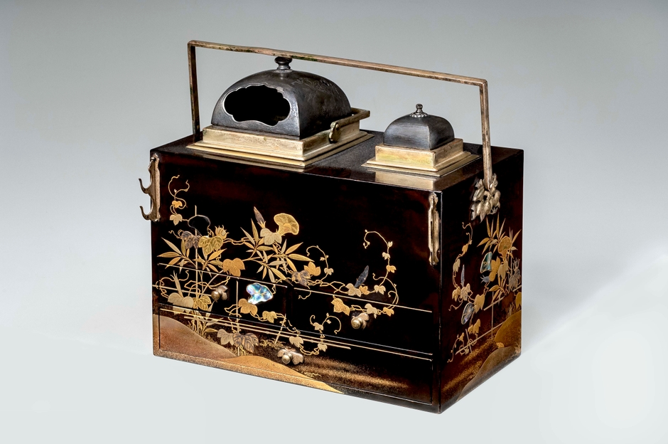 三方に風よけがある「風覆形」のたばこ盆。本体には、葵と唐草が蒔絵で丁寧に描かれており、風覆に桐鳳凰文様の布を用いるなど見どころが多い。