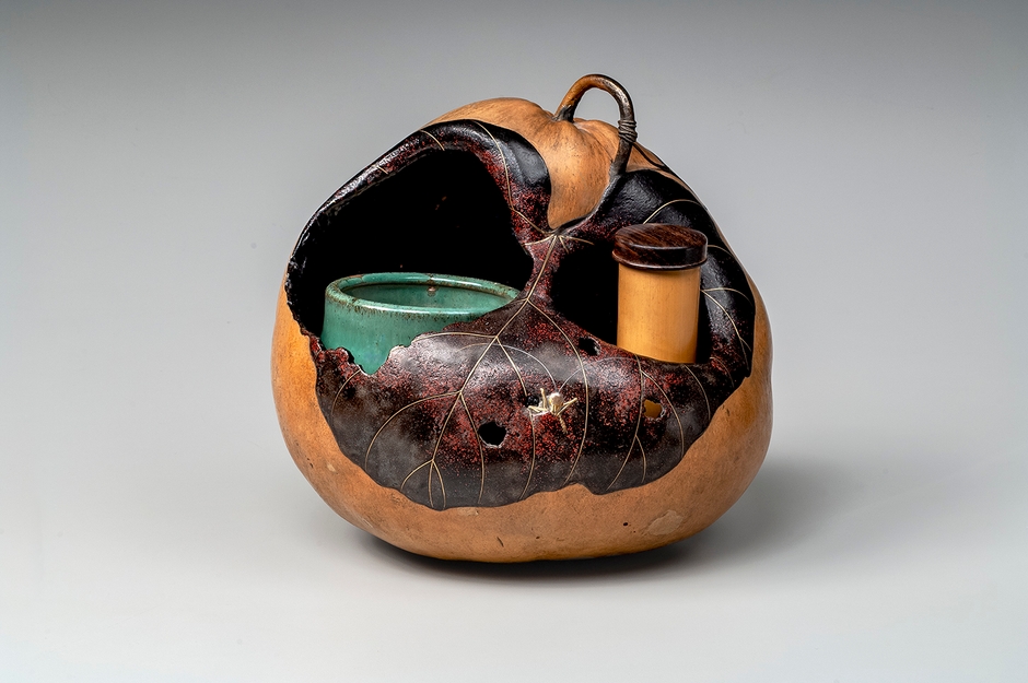 火屋を茅葺屋根に見立て、火入れ周りの造形に工夫が見られるたばこ盆。本体を覆う縄暖簾の蒔絵も見事で、縄の縒り一つ一つを描いており、細かな仕事に圧倒される。