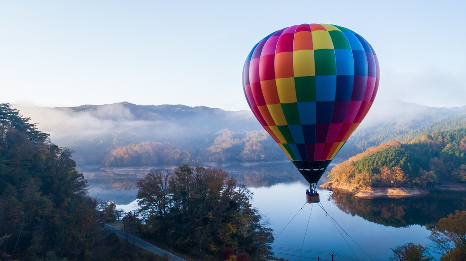 三河湖畔の広場で係留された熱気球(定員5名)に乗り、三河湖の美しい自然の中で5分間のフライトをお楽しみください。上空から見下ろす秋の三河湖は絶景です!ご宿泊やお食事等とセットになったお得なプランも用意しています。