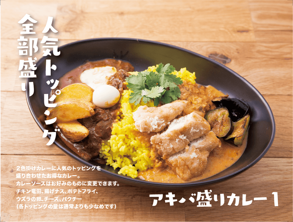 定番のカリガリカレーベースで秋葉原生まれの「アキバ盛りカレー1」と新作で突き抜けるスパイス感が魅力の「超スパイスカレーDX」。二つの人気のカレーで皆さんのご来店を心よりお待ちしております。