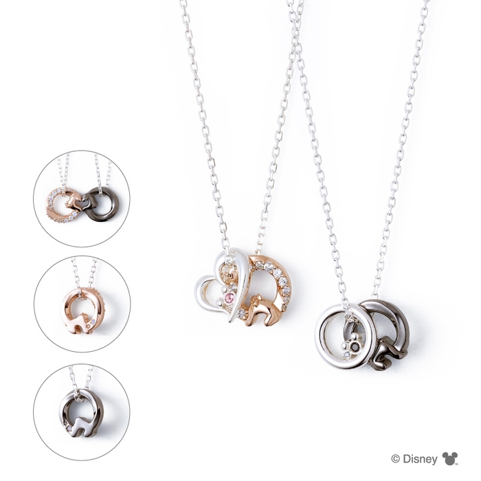 ミッキーとミニーの手を合わせると、ハートが完成するDuetシリーズのペアネックレス。