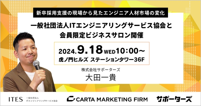 株式会社CARTA HOLDINGS(以下、CARTA HD)のグループ会社で、マーケティング特化の事業を展開する株式会社CARTA MARKETING FIRM(東京都港区虎ノ門、代表取締役:西園 正志、以下CARTA MARKETING FIRM)は、エンジニア業界全体の成長と知名度向上、バリューの追求・推進を目的に、2024年9月18日、一般社団法人ITエンジニアリングサービス協会(東京都千代田区、代表理事:橋田 博明、以下ITES)と共同で、ITES会員限定ビジネスサロンを開催します。