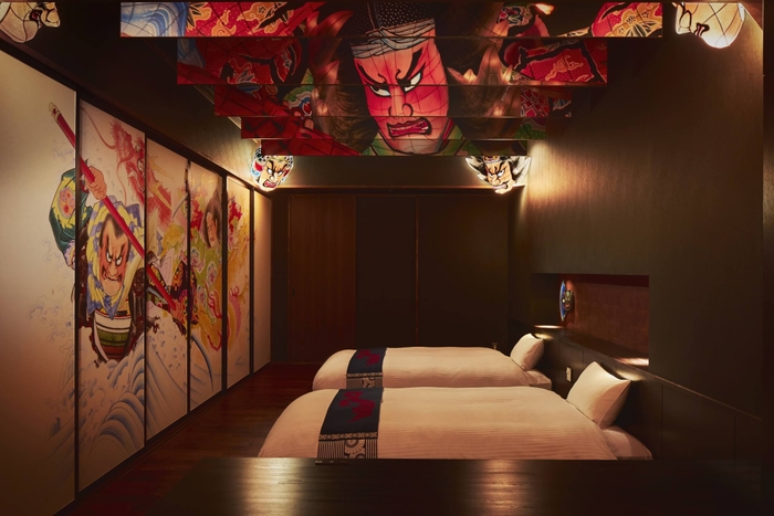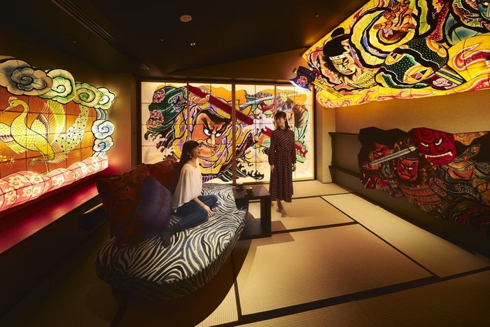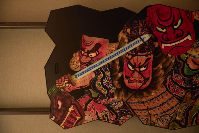 青森ねぶたの間は、青森ねぶた祭をテーマにし、2019年4月に完成した1室限定の客室です。ねぶた師である竹浪比呂央(たけなみひろお)氏の協力のもと、玄関、主室、寝室など客室全体にねぶたを設えました。