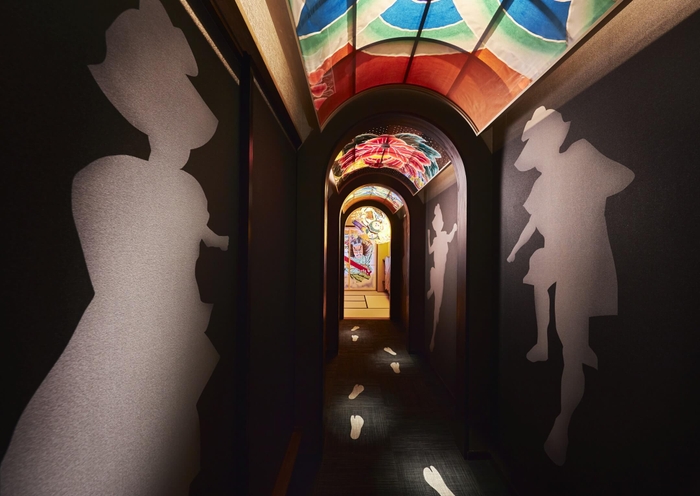 跳人とは、青森ねぶた祭の踊り手のことです。「ラッセラー!」の掛け声とともに左右2回ずつ跳ねるステップで、祭りを盛り上げます。玄関から主室に続く廊下の床には、跳人の足跡が付いており、それに合わせて進むと、自然とステップを踏むことができるようになっています。客室にある跳人の衣装を身につけ、好きなときにいつでも跳ねられます。