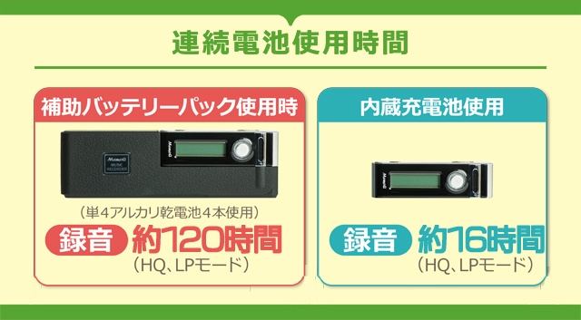 電池パックを使えばなんと最大で120時間も連続録音が可能です。