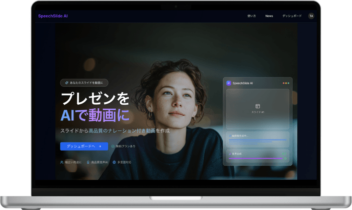 SpeechSlide AI( https://speechslide.com/ )は、スライド資料(PDF等)からAIが自動でスピーカーノートを生成し、TTS(Text-to-Speech)でナレーションを付与することで、数クリックで高品質なプレゼン動画を作成できるサービスです。多言語対応や音声スタイルの選択が可能で、商品紹介や企業プレゼン、研修動画、研究発表など幅広く活用されています。
