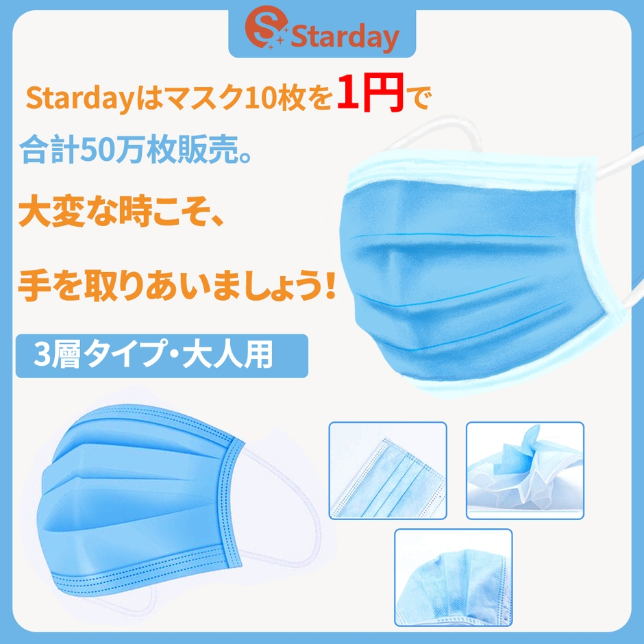 新型コロナウイルス対策として、Stardayはマスク50万枚を用意致しました。お1人様1点まで、10枚を1円で販売致します。