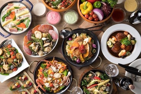 ヨーグルトサラダ、玉子サラダ、めんたい玉子、グリンピースのフラン、黒オリーブのパフェ、“赤じそ”トマトウォーター、海の幸のマリネ、パンツァネッラ、季節の野菜と鶏肉のシチュー カルボナーラ風、海の幸のパエリア、クラムチャウダー、白身魚のワイン蒸し グラタン仕立て、本格四川麻婆豆腐、ストーブ鍋 スパイシー赤カレー、ストーブ鍋 黒カレー