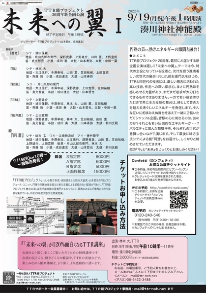 TTR能プロジェクト 新企画公演『未来への翼 Ⅰ』が2022年9月19日(月・祝) に湊川神社能楽殿(兵庫県神戸市)にて上演されます。チケットはカンフェティ(運営:ロングランプランニング株式会社、東京都新宿区、代表取締役:榑松 ⼤剛)にて発売中です。