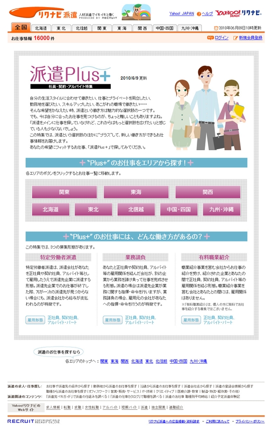 株式会社リクルート(本社:東京都千代田区、代表取締役社長 兼 CEO:柏木斉)が運営する『リクナビ派遣』(http://rikunabi-haken.yahoo.co.jp/)では、6月9日より新たな特集「派遣Plus+ ~社員・契約・アルバイト特集~」をスタートいたします。