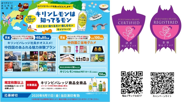 福山市都市ブランド戦略推進協議会が実施している「福山ブランド」がキリンビバレッジ株式会社のキャンペーン「キリンレモンは知ってるモン 行くモン・食べるモン・楽しむモンキャンペーン」の賞品として採用されました。