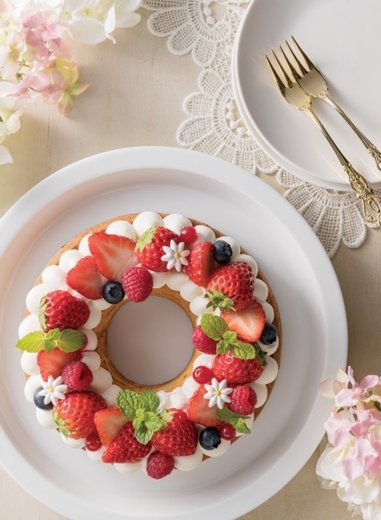 カスタードクリームをしぼり、ストロベリー、ブルーベリー、フランボワーズ、グロゼイユを華やかに飾り付けた春らしいリース型のタルト。ご家族で楽しめるひと品。