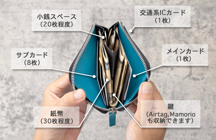 ・また「現金派」のニーズもくみ取り、紙幣や硬貨もしっかりと収納でき、かつパンツのポケットに収まる、薄くてコンパクトな財布に仕上げた(サイズ:縦96mm、横106mm、薄さ19mm。カード収納:内側2ヵ所に計8枚、外側1ヵ所に1枚交通系IC対応。札入れ3パターンで分けて収納可能)