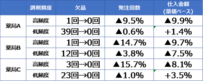このデジタル基盤の上に、AIを活用した需要予測サービスを開発し、複数の薬局の在庫データを元に検証を行った結果、欠品回数、発注・納入回数、毎月末の在庫金額を削減できることを確認いたしました。また、6月末よりAIによる在庫適正化サービスを導入し実運用に入った薬局もあり、コロナ禍において処方箋枚数の減少や長期処方の増加へと市場が変化する中においても、一定の評価を得ております。