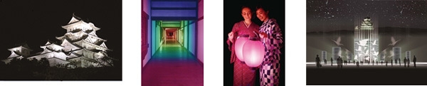 会場となる西の丸庭園および百間廊下では、見学者が夜間に特別公開される「光の回廊」をLED提灯片手に進む様子が、イルミネーションの一部と化します。三の丸広場では、光が照らされ白く美しく浮かび上がった姫路城を背景に、圧倒的なスケールのプロジェクトマッピングとレーザーで演出された、魅せる「白鷺飛翔(しらさぎひしょう)」をご覧いただけ、昼間とは異なる美しい姫路城をお楽しみいただけます。