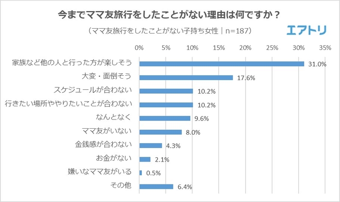 ママ友旅行をしたことがない子持ち女性に理由を聞いたところ、「スケジュールが合わない」「行きたい場所ややりたいことが合わない」などの具体的な理由を抑えて、「家族など他の人と行った方が楽しそう」、続いて「大変・面倒そう」がトップに並び、食わず嫌いを起こしている人が多いことが分かりました。おそらく、ママ友は子供が生まれてからできた友達なので、付き合いが短く浅いことが多いためにママ友と泊まりということに対して不安を覚えている人が一定数いるのだと想定されます。